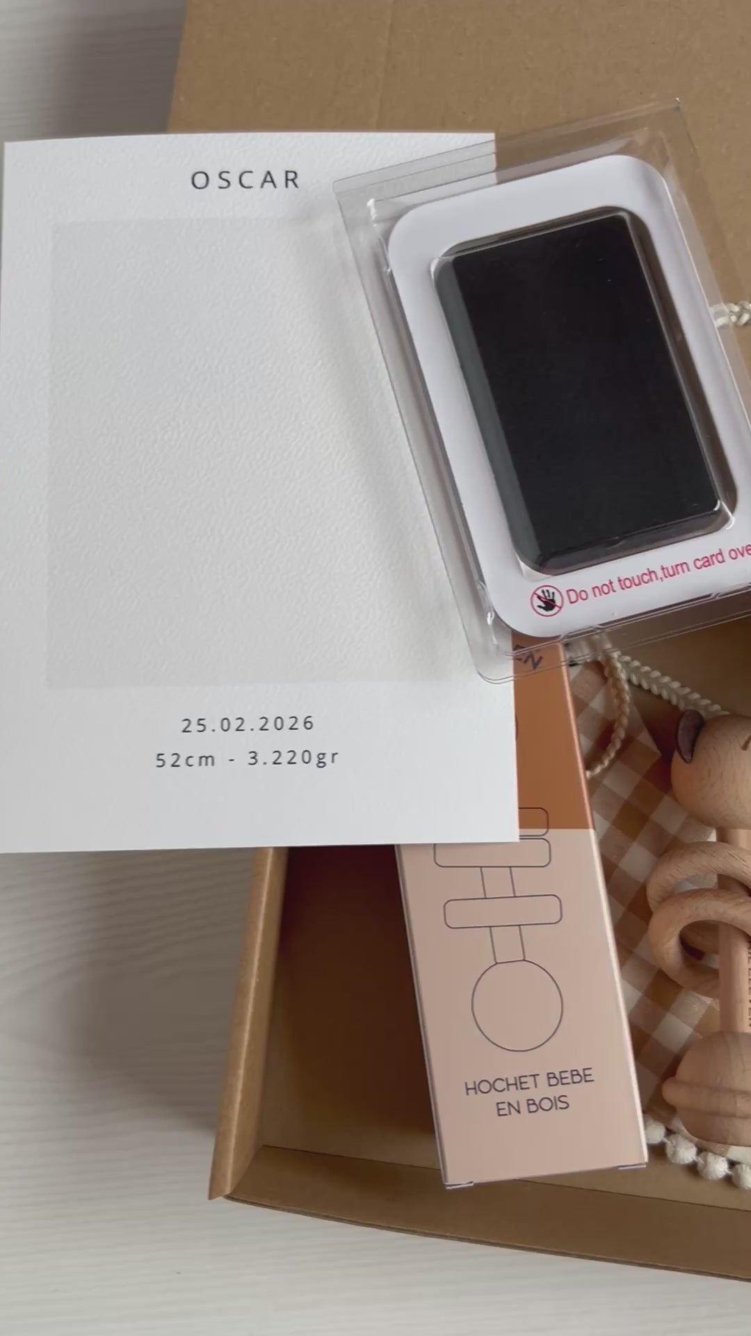 Le coffret contient également plusieurs objets symboliques des premiers mois : un bavoir bébé en coton doux, un hochet en bois naturel en forme d’animal, un petit hochet lune ainsi qu’un support pour conserver le bracelet de naissance de la maternité. Chaque élément rappelle un moment particulier des débuts de la vie.